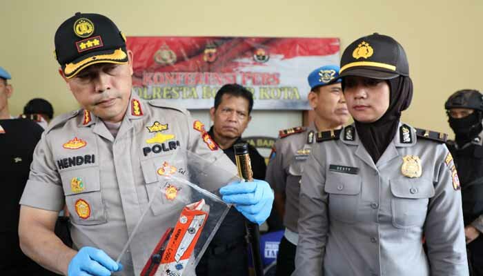 Kapolresta Bogor Kota, Kombes Pol Hendri Fiuser menunjukkan cutter barang bukti pembunuhan kepada wartawan .(yopi)