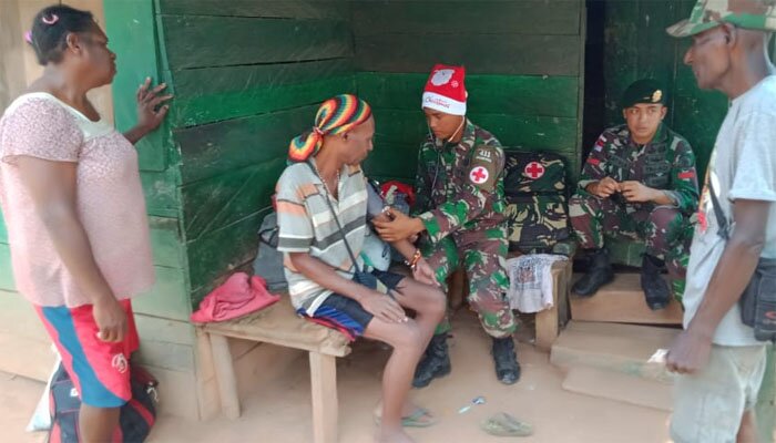 JAKARTA – Sebagai wujud rasa peduli kepada masyarakat dalam menyambut suka cita perayaan Hari Natal di perbatasan, dengan menggunakan topi Santa Claus, tim Kesehatan Satgas Pamtas RI-PNG Yonif MR 411/Pdw Kostrad memberikan pelayanan kesehatan keliling di sekitar Pos Barki Distrik Sota, Kab.Merauke.